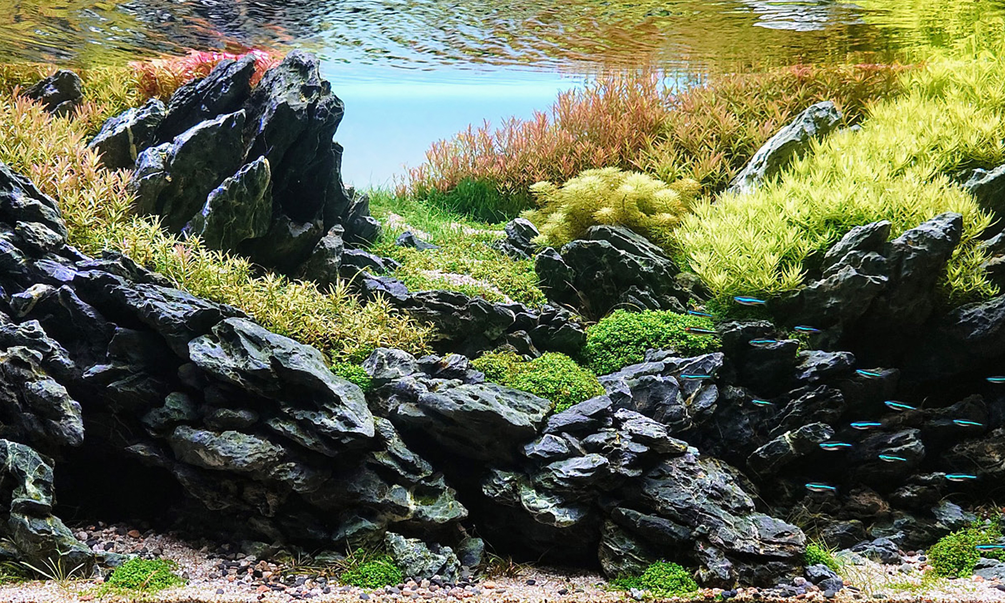 以岩石為主角,水草為輔,畫面簡潔、乾淨。 它通常遵循「三石原則」(Triad of Rocks),即由一塊主石(Oyaishi)、一塊副石(Fukuishi)和一塊捨石(Suteishi)構成,強調岩石間的平衡與和諧,很適合想要極簡風、桌邊觀賞的魚友。