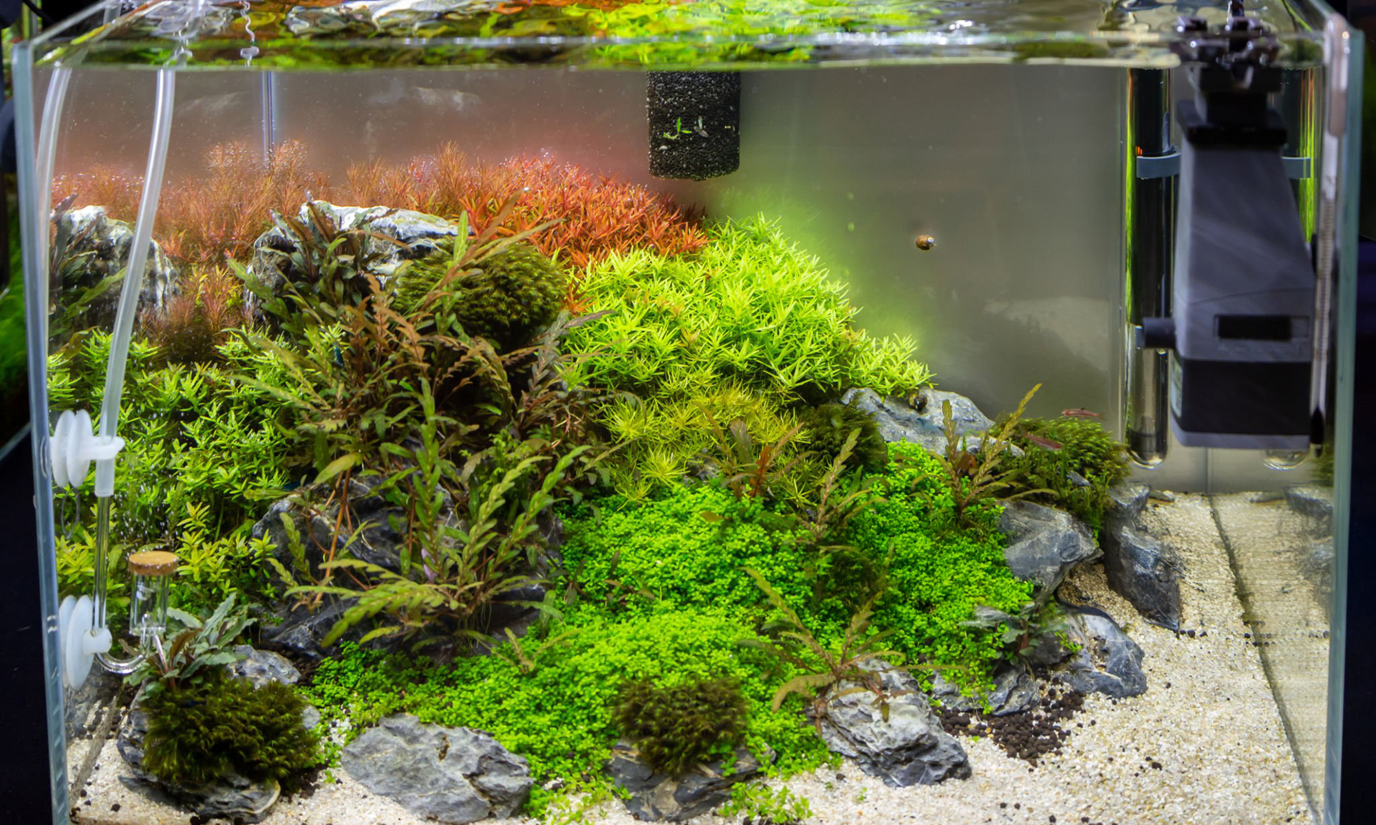 過濾器、加溫棒、打氣設備都很重要, 但記得盡量藏在後景或沉木後方, 畫面會乾淨很多。 像圓桶過濾、外掛過濾,都是常見好選擇。