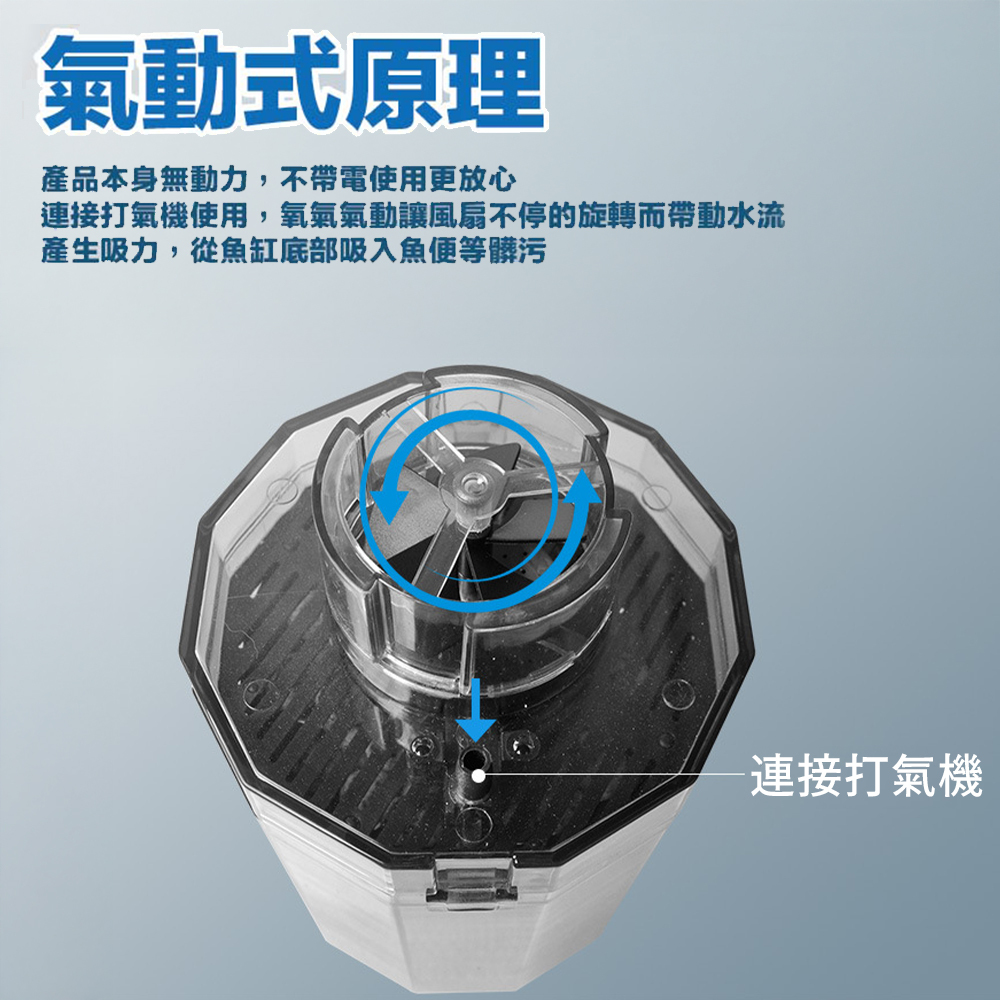 透過打氣機產生的氣泡推動內部葉扇旋轉