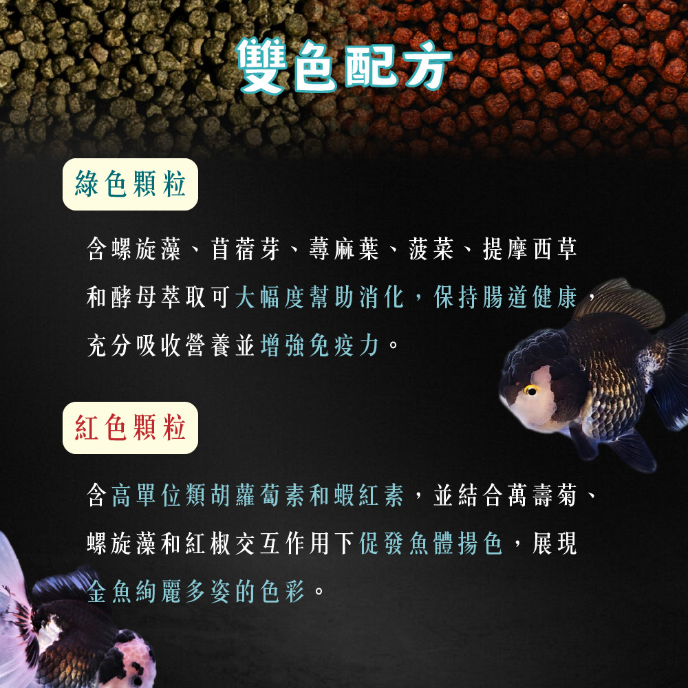 | 餵食方法 | 每日2至3次,如未攝食完,請清除殘餌,降低水質污染 |