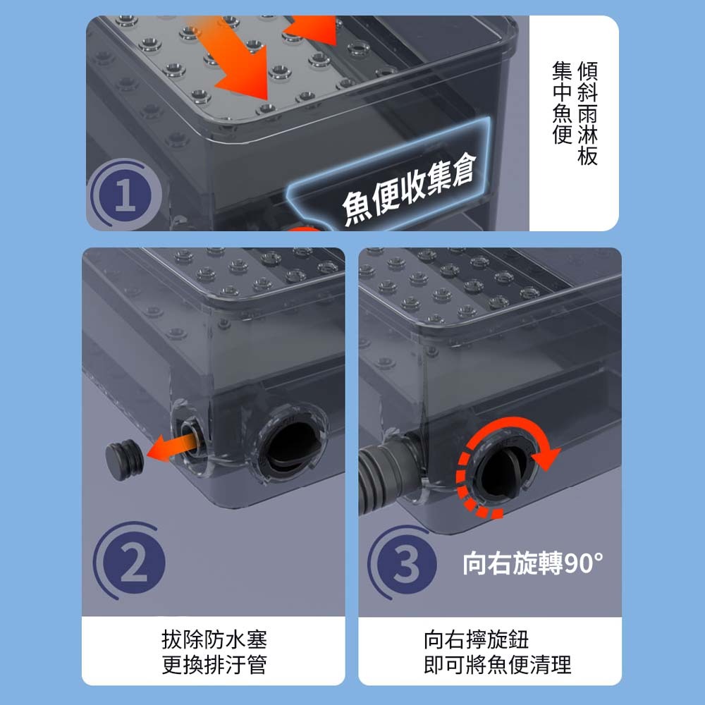 魚便獨立排汙艙,有效隔離魚糞與懸浮顆粒